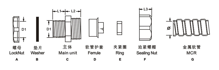 特點:一端連接金屬軟管,另一端由螺紋連接箱體或設備,具有結構緊湊,防水,耐腐蝕等特點。